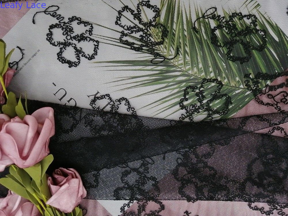 نسيج دانتيل مطرز بالزهور باللون الأسود 0