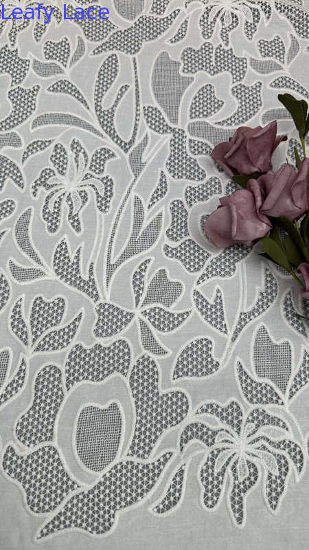 قماش دانتيل مطرز بزخارف أوراق الشجر الرقيقة هو خيار شائع لفساتين الزفاف والحفلات، مما يوفر الأناقة والملمس والتفاصيل المعقدة. تتضمن التكنولوجيا الكامنة وراء إنتاجه مزيجًا من الحرفية التقليدية وابتكارات المنسوجات الحديثة.
