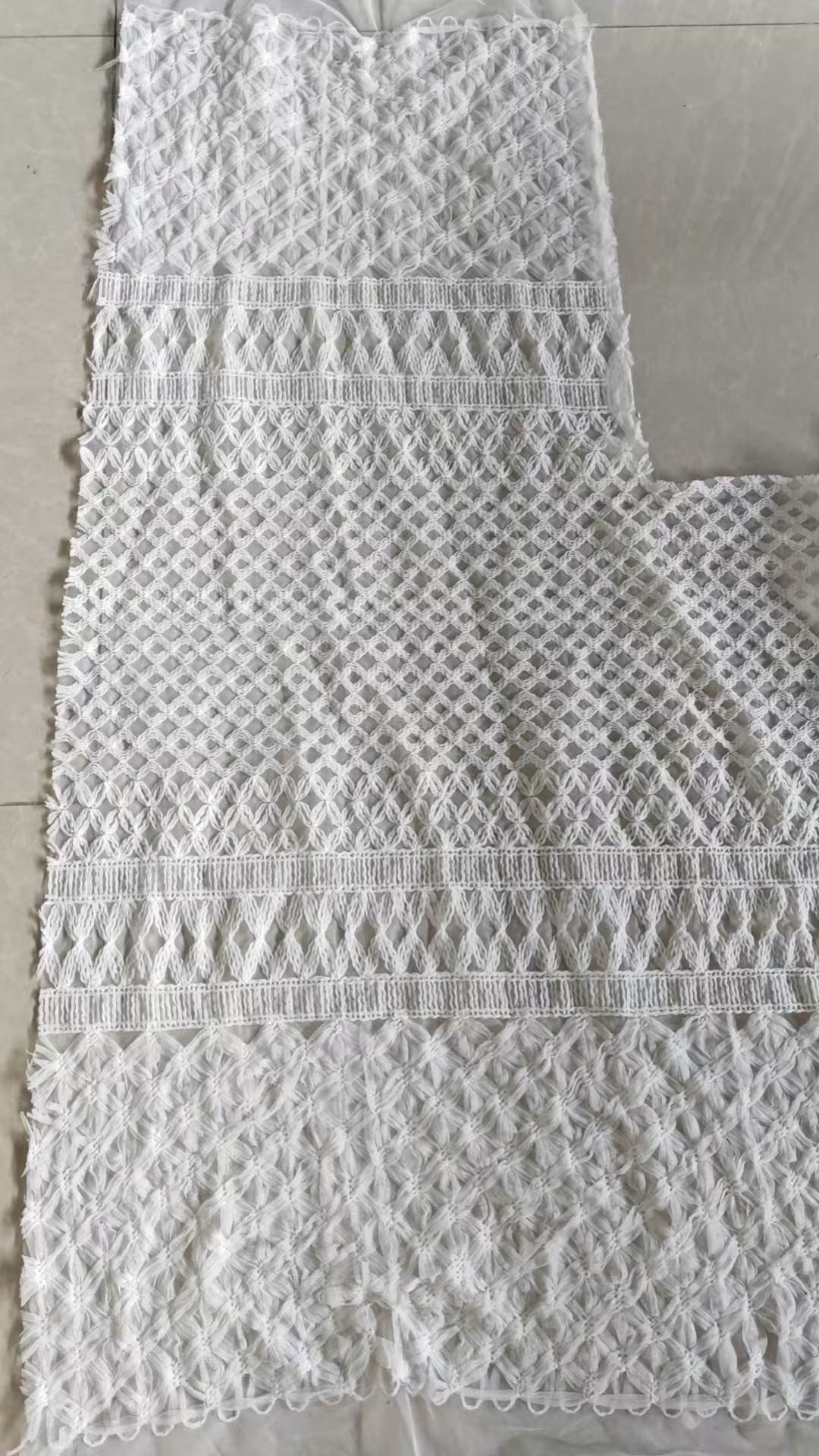 Lace embroidery fabric with delicate leafy motifs is a popular choice for wedding and party dresses, offering elegance, texture, and intricate detailing. The technology behind its production involves a blend of traditional craftsmanship and modern textile innovations.